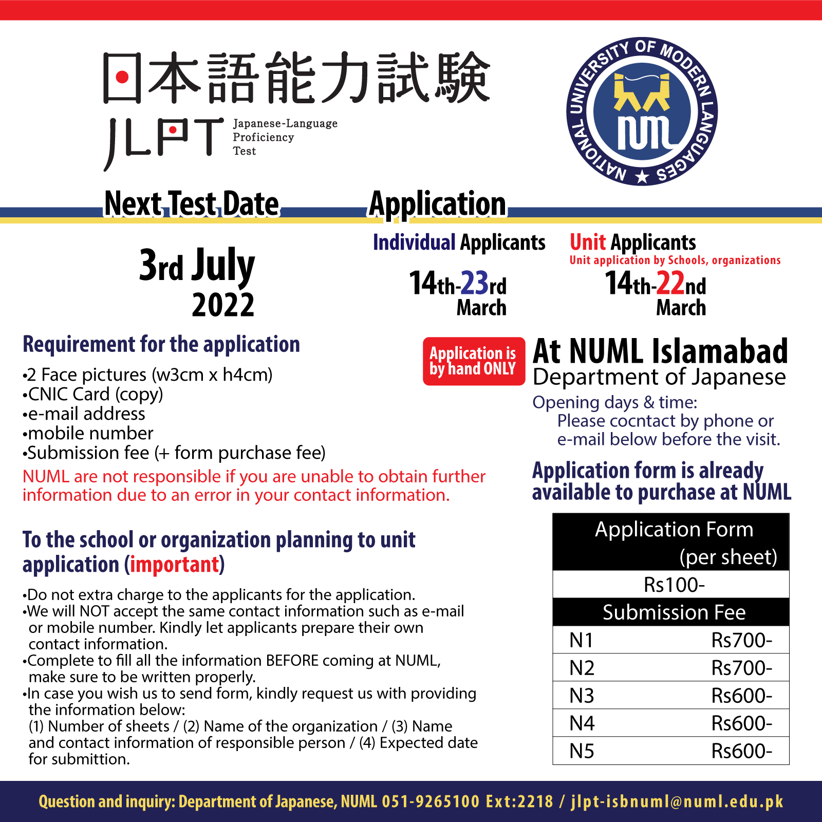 JLPT?? (3rd July 2022)application will start from Mon 14th March at NUML, Islamabad, Pakistan??.